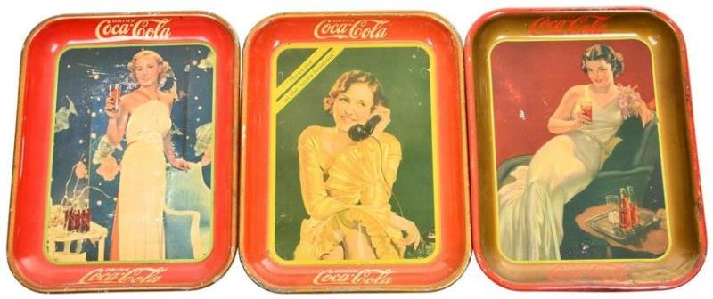 Coca-Cola: Three (3) Serving Trays, 1930, 1934 and 1936. Three (3) Coca-Cola serving trays from the 1930s manufactured by American Artworks in Coshocton, Ohio and all 13¼ x 10½". 1.) Tray from 1930, "Telephone Girl" on the phone saying "Meet…