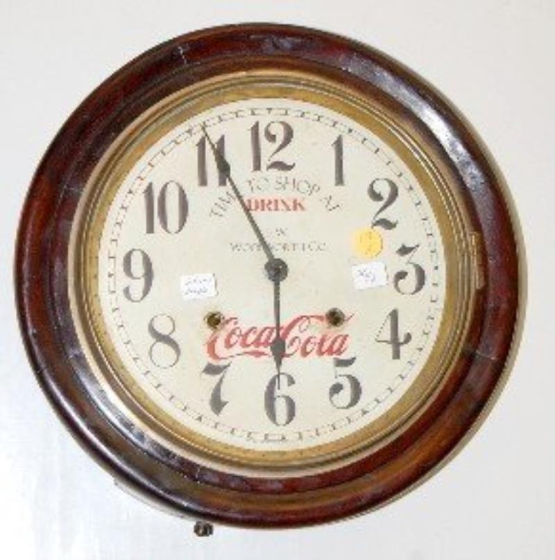 Mahogany Round Gallery Clock w/Coca Cola Advertising: with time and gong striking movement. The 10" dial has "Time to Shop at F.W. Woolworth Co.- Drink Coca Cola".(Not running. The dial is a bit scuffed up.)13 1/4"All items sell As Is,…