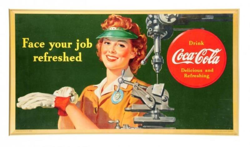 This cardboard sign shows a woman factory worker standing at a drill press. It retains its original Kay Display frame. The sign has some cardboard loss on the corners, some paper lifting on the top of the Coca-Cola button logo…