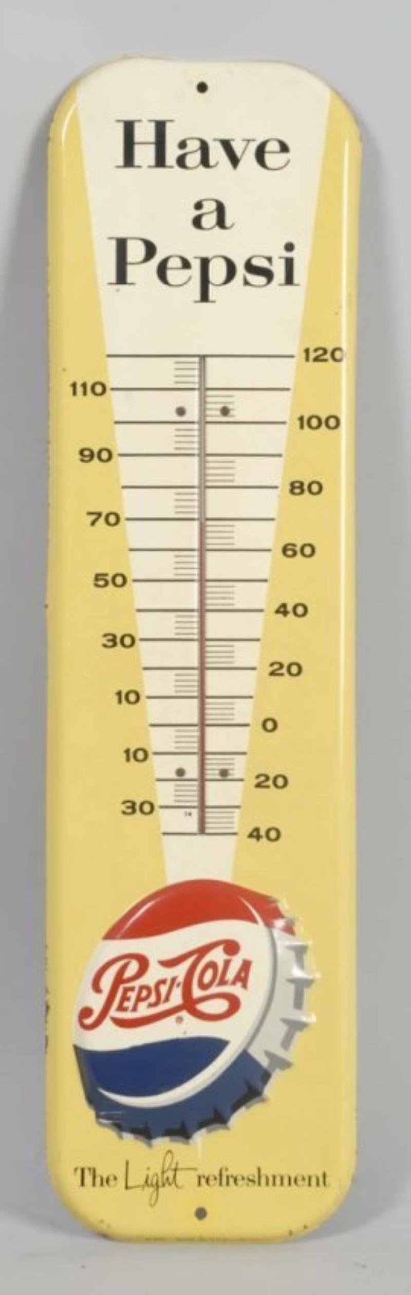 Includes a 1950s Pepsi in respectable condition. Modest amounts of overall wear. A 1940's Coca-Cola tin thermometer with general overall wear. Thermometers appear to be fairly accurate on both pieces. Condition (Very Good - Excellent). Size Largest: 27" T.