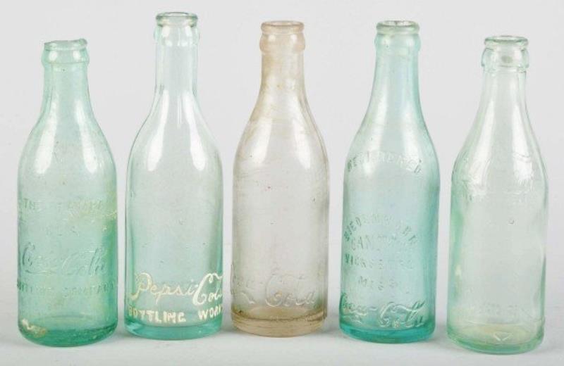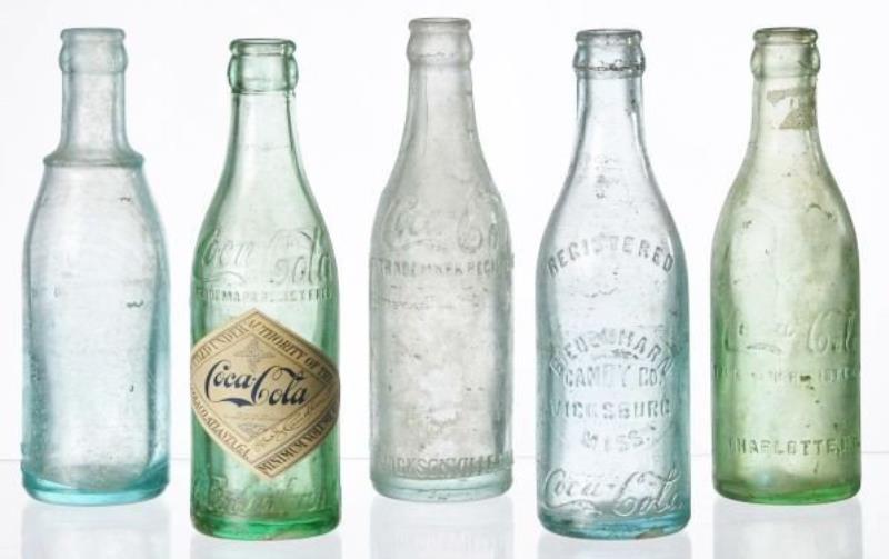Description Includes a Plain Flavor from Wilmington, NC and the other four bottles are all marked Coca-Cola from Charlotte; Vicksburg, Mississippi; another Vicksburg with Biedenharn in script on bottom and a Jacksonville bottle. General wear, three of the bottles are…