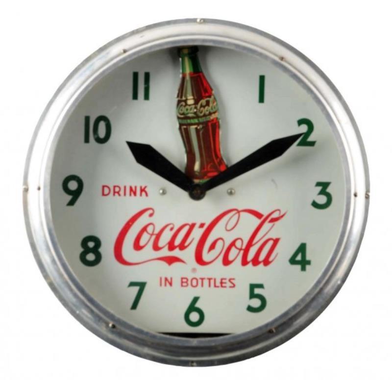 Very bright and clean example, works fully and bottle rocks. A beautiful piece that is all original. This version features the neon under glass in an enclosed aluminum case. Made by Swihart Products with the original decal at the bottom of the clock. Only a short 3" closed crack in the outer glass near 4 o'clock. No fading on the bottle, makes it impossible to improve upon. 9.4 - 9.7. Condition (Near Mint). Size 20" Dia.