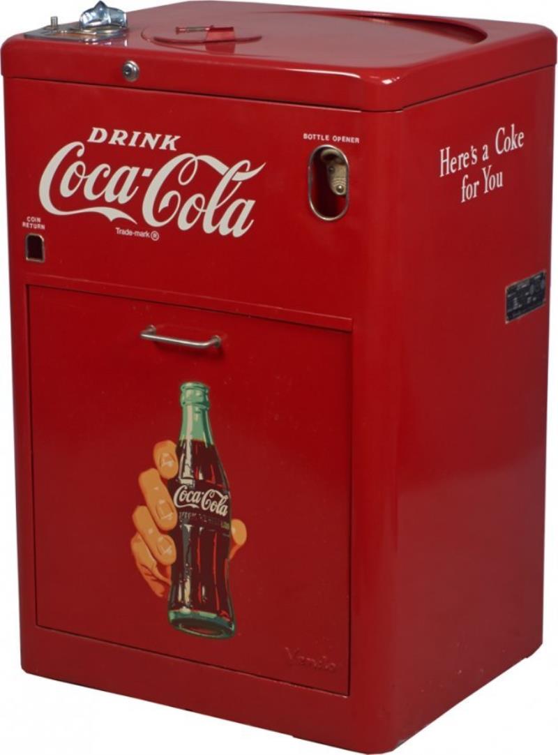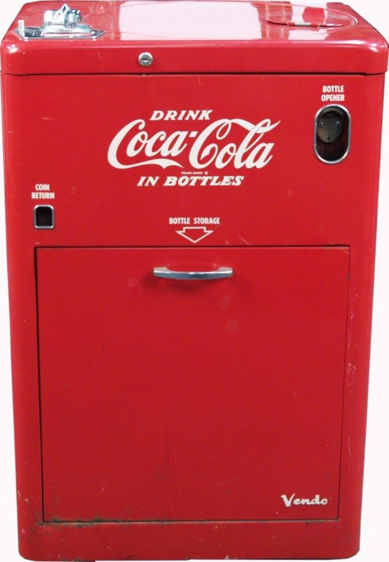 Coca-Cola Vendo Model B59C5 "Spin-Top" Machine - Offered Without ReserveVery rare survivor in original red finish with Coca-Cola with original 10-cent coin box, opener with cap-catcher, no keys. 32" W x 27" D x 47" H (at coin box).