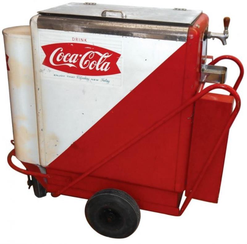 Coca-Cola stadium vendor's cooler w/fishtail decals, spigot to serve carbonated Coca-Cola, curved front for tank, on wheels for easy transport, Rare & in Good cond w/significant paint loss on one side, 46"H x 26"W x 53"L.
