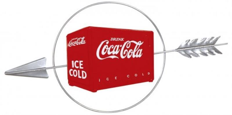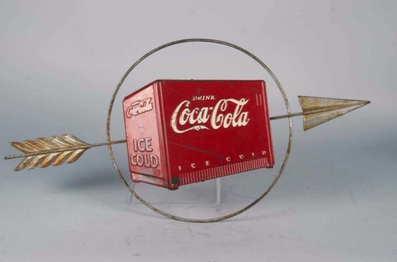 Coca-Cola arrow sign w/embossed metal cooler, stamped
