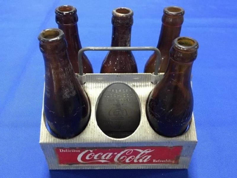 Aluminum Coca-Cola carrier with 5 Amber bottles from: 1 bottle from Bristol, VA-has chip at top and bottom. 1-Knoxville, TN- Good found condition, 1- Memphis, TN-Good found condition, 2-Chattanooga, TN-Good found condition, Local Collectors check this out!