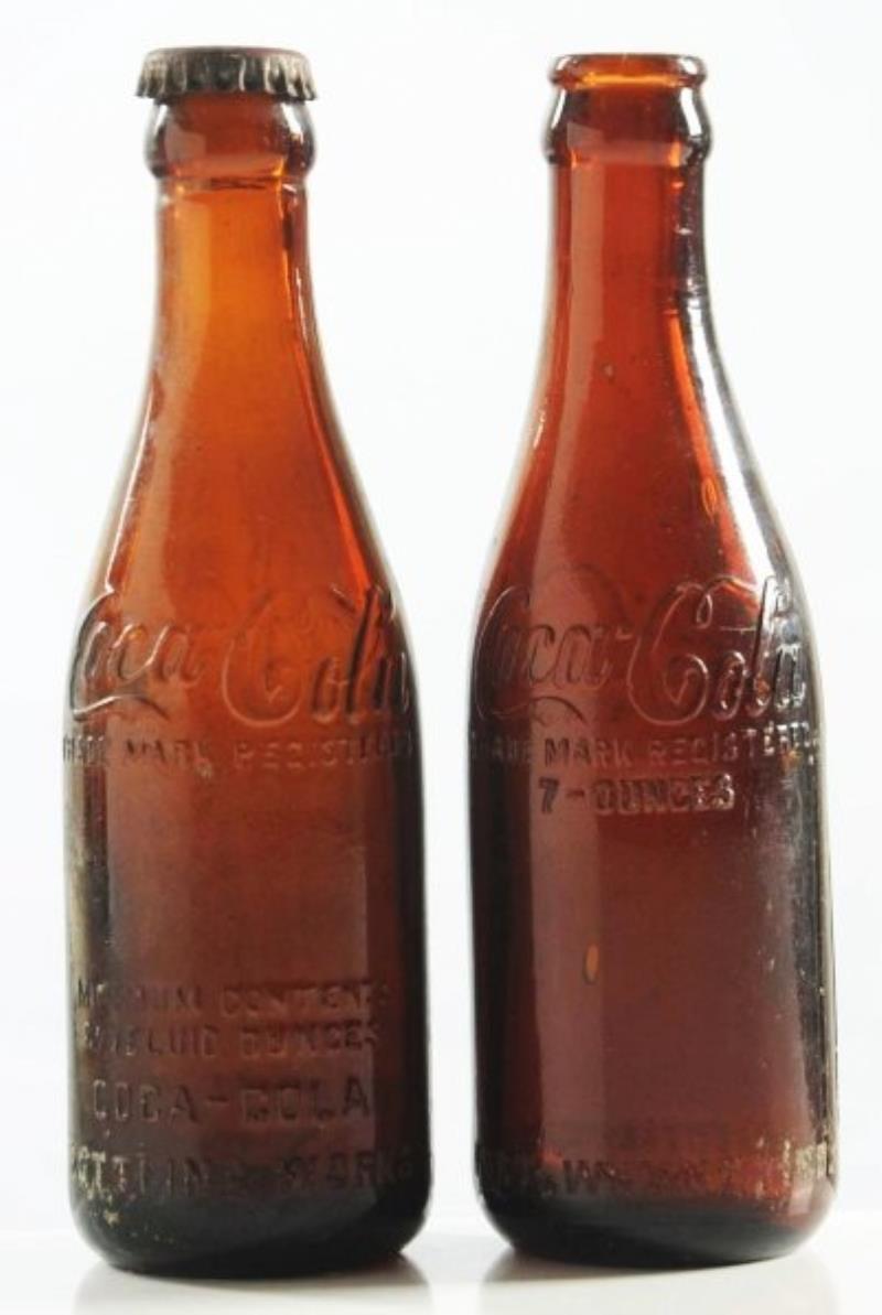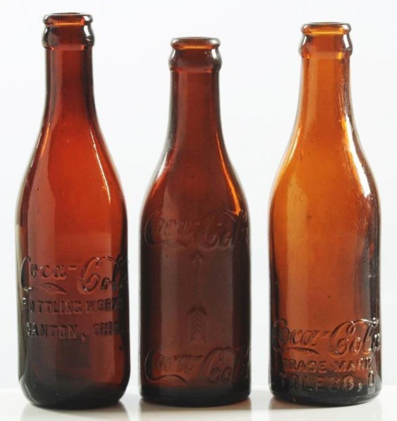 Soda- 4 Amber Coca Cola- 1.) Greenville Miss., with arrow (nice golden amber); 2.) Akron, OH, with arrow; 3.) Toledo, OH, double diamond with script inside; 4.) Lexington, KY. 7 3/4''