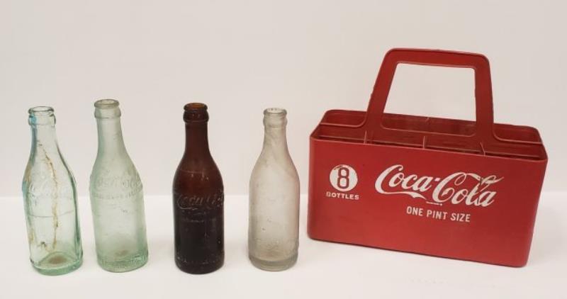 4 Embossed Coke bottles: Amber Knoxville arrow bottle, Lexington TN, Jacksonville FL, and an embossed Coca Cola on the bottom bottle. This lot also includes the 8 bottle plastic Coca cola carrier. PLEASE READ & UNDERSTAND THE PAYMENT & SHIPPING…