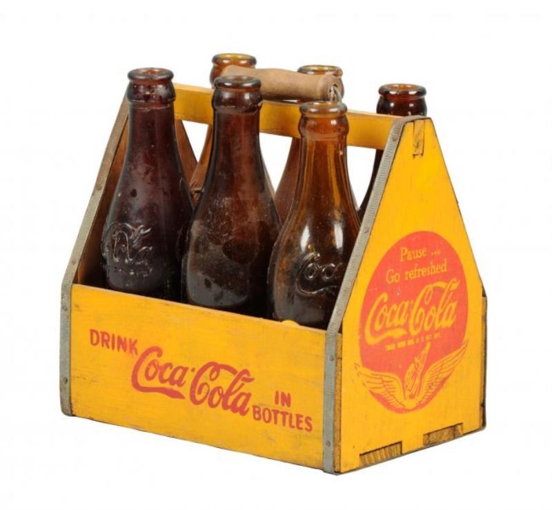 Coca - Cola Wooden Carrier & Amber Bottles.