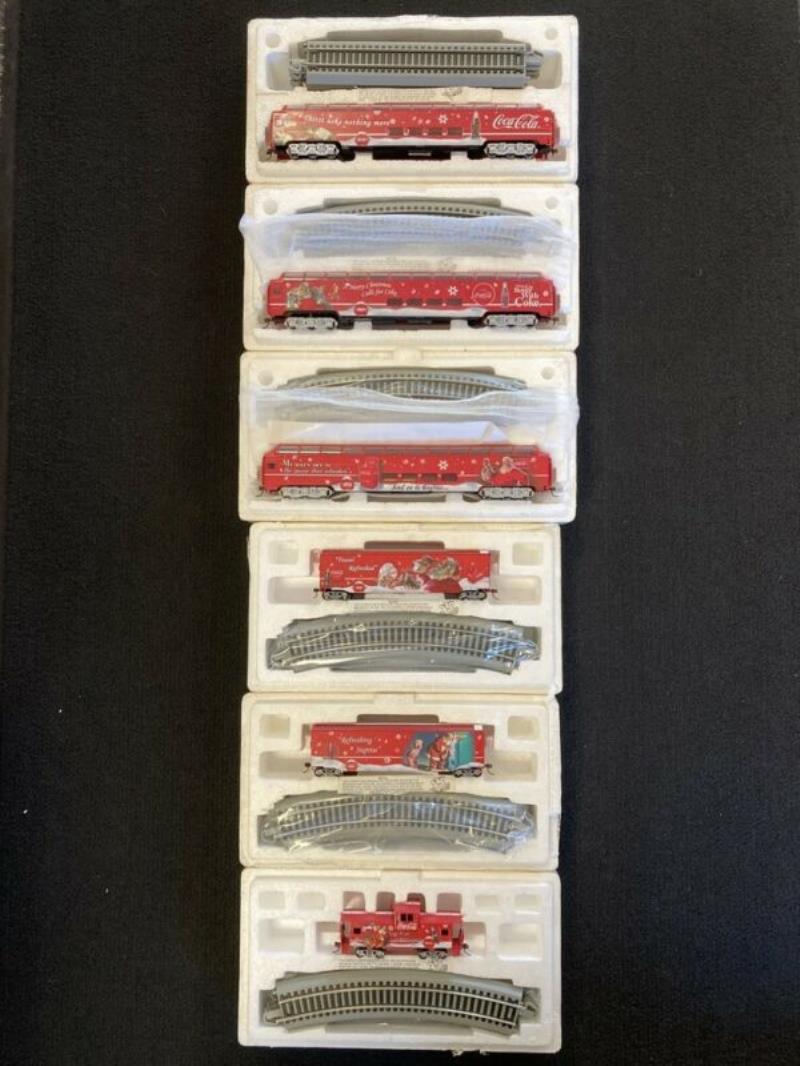 PREVIOUSLY OWNED HAWTHORNE COCO-COLA TRAIN SET WITH CONTROLLER / CORDS / TRACK / PASSENGER CARS / CARGO CARS / MAIN ENGINE / CABOOSE ALL IN PROTECTIVE PACKAGING , PLEASE REFFER TO PICTURES FOR CONDITION / EVERYTHING INCLUDED WITH SET IS…