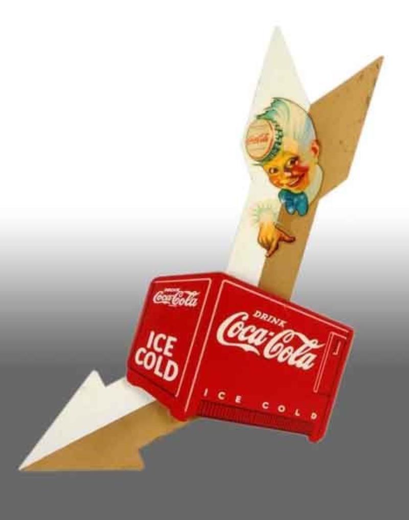 DST. 1920's Coca Cola tin arrow sign. Marked "Copyright 1927". Areas of significant paint loss on edges and back portion of arrow. Some staining and scratching throughout. This is a very unique Coca-Cola sign and very difficult to acquire in…