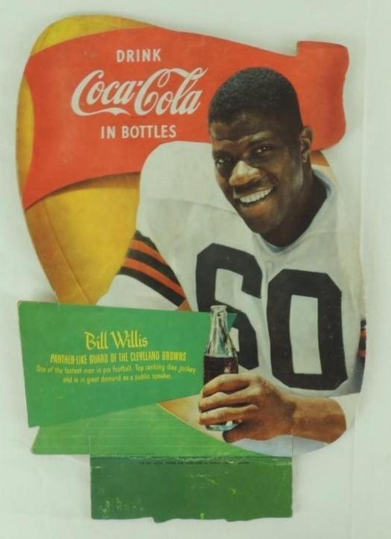 Drink Coca Cola in Bottles" exclaims this rare cardboard advertising sign from the Cleveland area circa 1953. Sign features Bill Willis In excellent condition, having retained it's vibrant original colors and displaying only minor edge wear, overall EX. Only a…