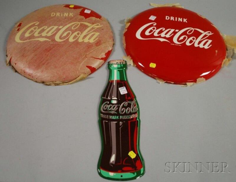 Pair of Coca-Cola Painted Tin Button Signs and a Coca-Cola Painted Tin Bottle-form Sign, c. 1952, (unused), dia. 16 and lg. 16 3/4 in., respectively.