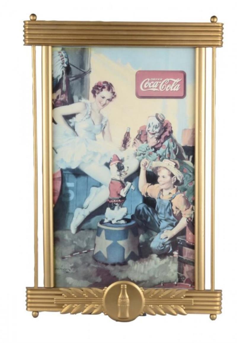 This cardboard sign features a group of circus performers enjoying bottles of Coke. Marked Snyder & Black Inc., circa 1936. Print shows slight uniform fade throughout and is without spots, folds, or tears. In gold painted wood display frame. Condition (Very Good). Size Poster: 27" x 16"