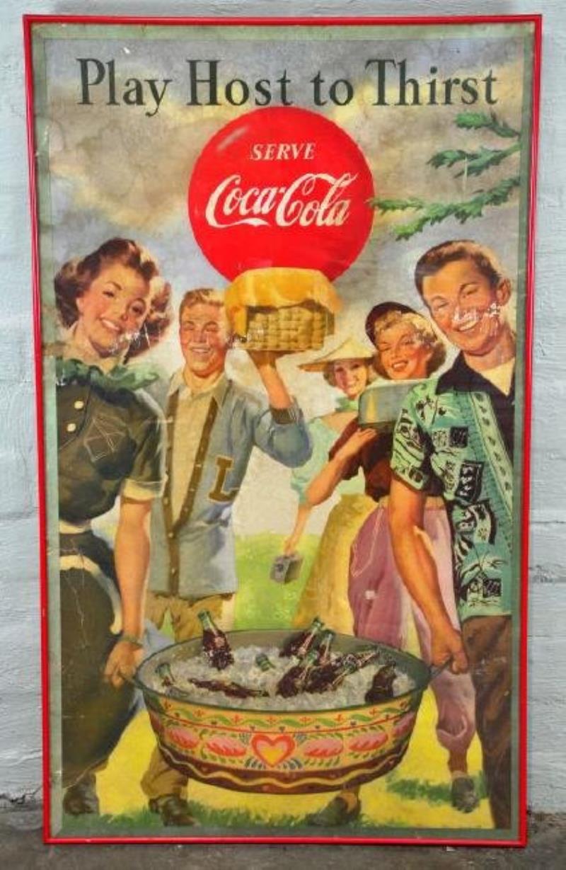 Canadian. 1941. Lithographed cardboard. Marked, "The Coca Cola Company of Canada, Limited. Lithographed in Canada 1941". 27 x 16". Small folds/bruising evident in all 4 corners. A little light creasing evident in upper left corner and several larger creases and…
