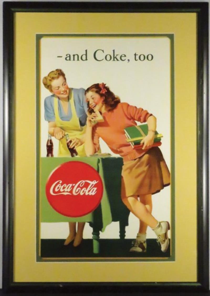 1950's Canadian Coca Cola Cardboard Sign. "and Coke, too!" depicting girl and her Mom after school. Near mint condition, framed under glass. 16 X 26 inches image only.