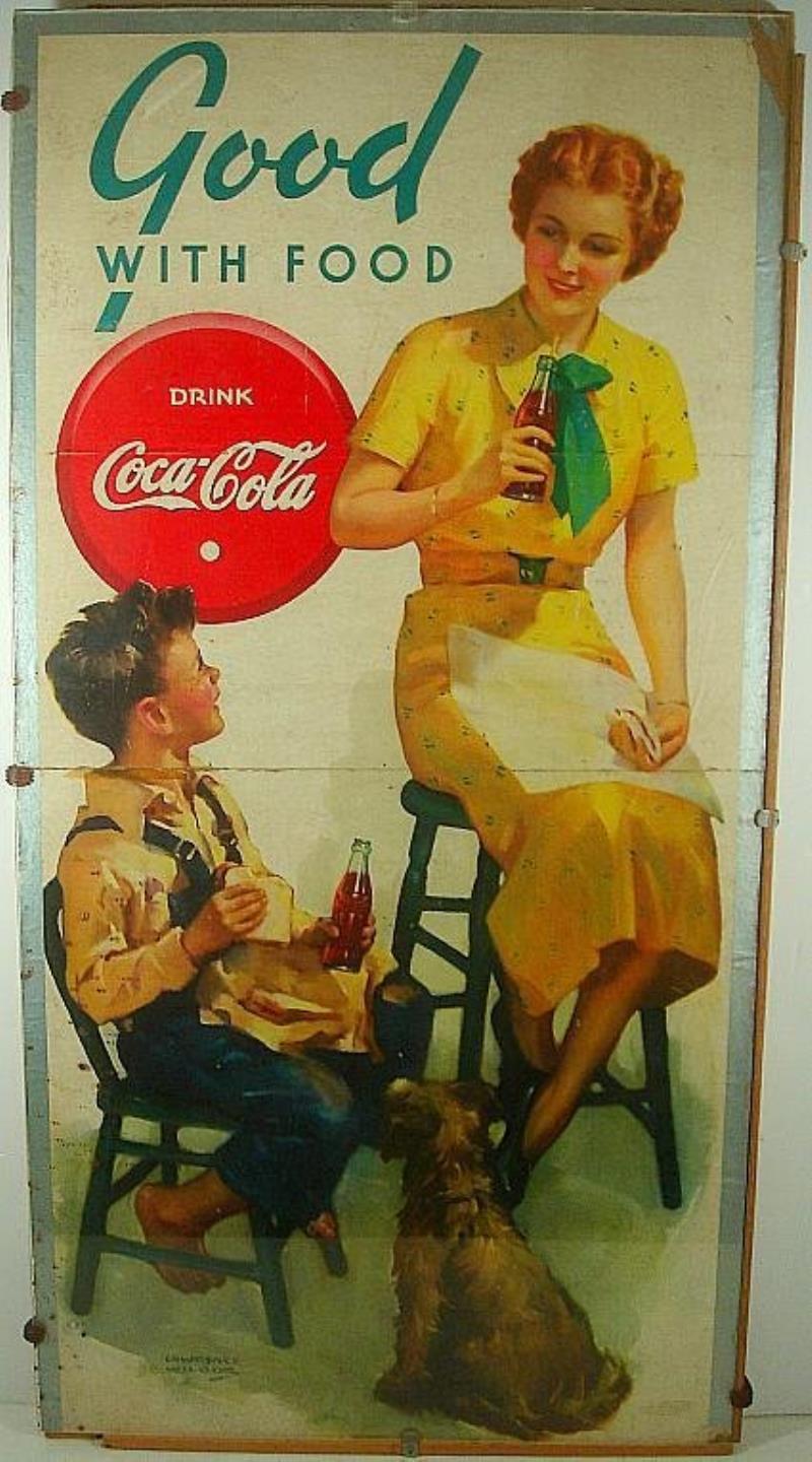 COCA COLA CARDBOARD SIGN, WOMAN AND CHILD EATING LUNCH