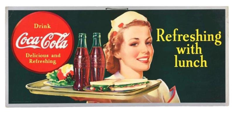 Coca-Cola cdbd sign, "Refreshing with Lunch," pretty girl serving tray of food & Coca-Cola, c.1941, VG cond w/minor wear, 14.25"H x 31.5"W.