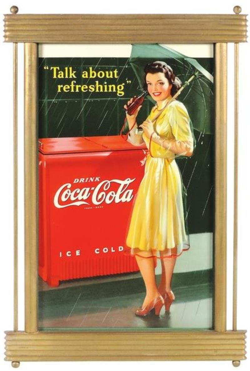 Coca-Cola Sign, Talk about refreshing, litho on cdbd, c.1942, pretty umbrella girl by cooler in 1940s gold wood frame, "like new" cond, 31.5"H x 21"W.