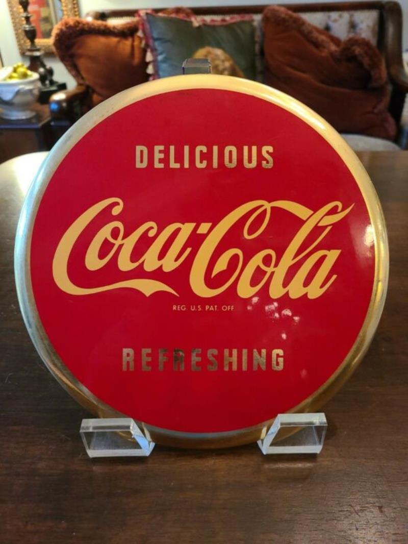 Extremely Rare 1942 Coca Cola Celluloid Button Sign. "Pause Go Refreshed". Near mint condition. 9 inch diameter.