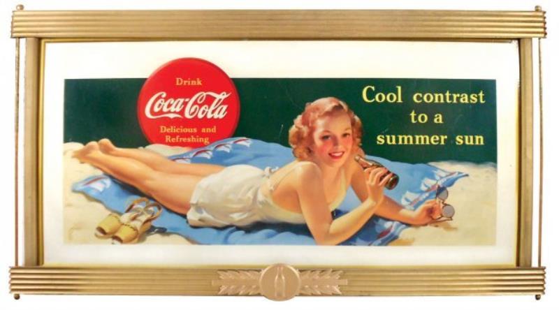 Coca-Cola sign & letter from model Miriam Day Drahos, "Cool contrast to a summer sun," Miriam in white swim suit on towel at beach, Miriam's handwritten letter describes this sign & others she posed for, written to Chuck Hardy in…