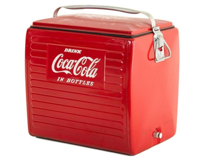 Carrying cooler. Has good color. Shows areas of wear and staining. Has bottle opener on side. Displays well. Measures: 12.5" x 17" Rating: 7 Est: $75-$150