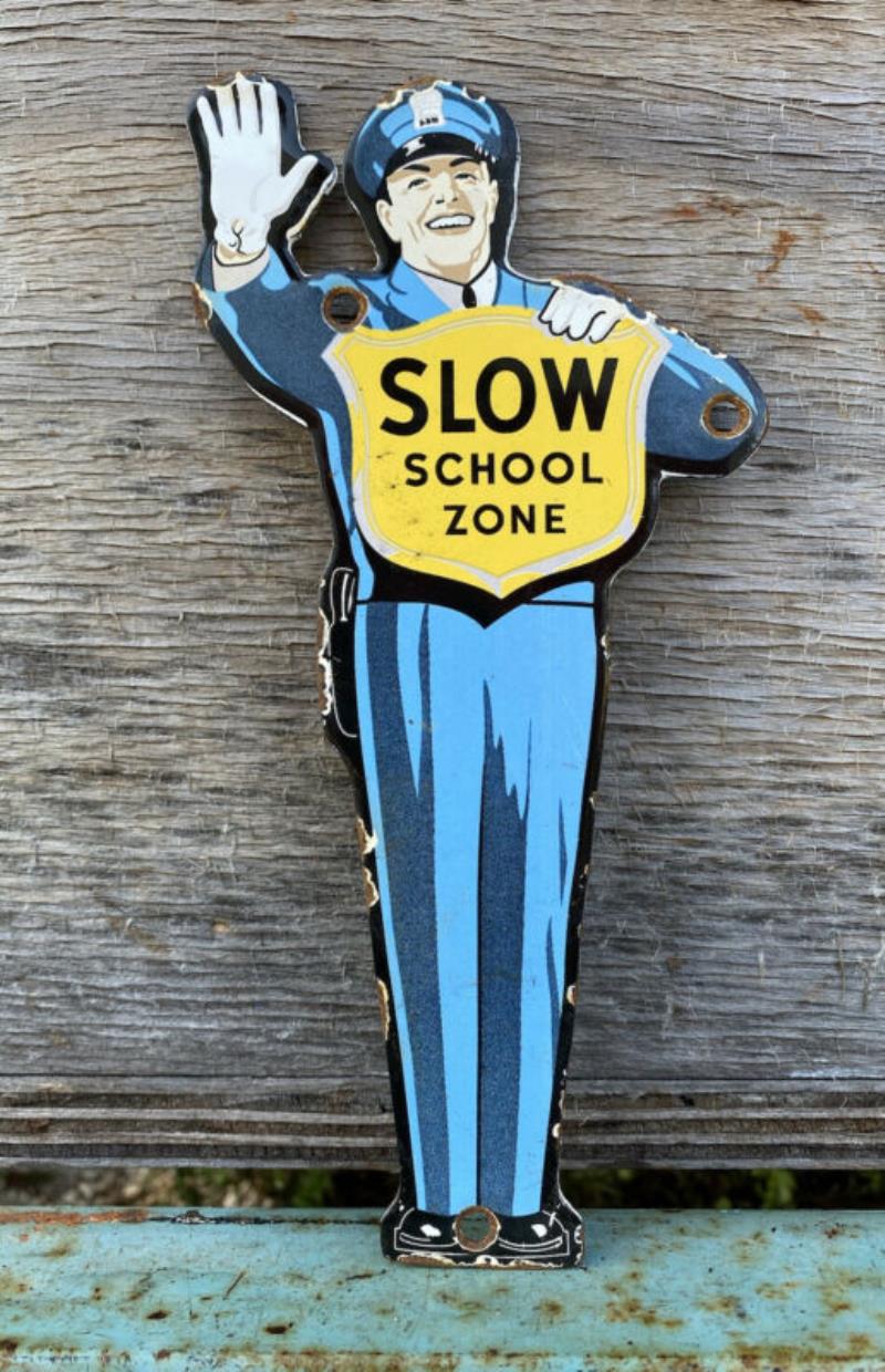 Police officer holding a slow in the school zone sign. This sign shows minor signs of use and age. The unique graphic content with vibrant colors makes this aGREAT addition to any collection! The signs have age on them and…