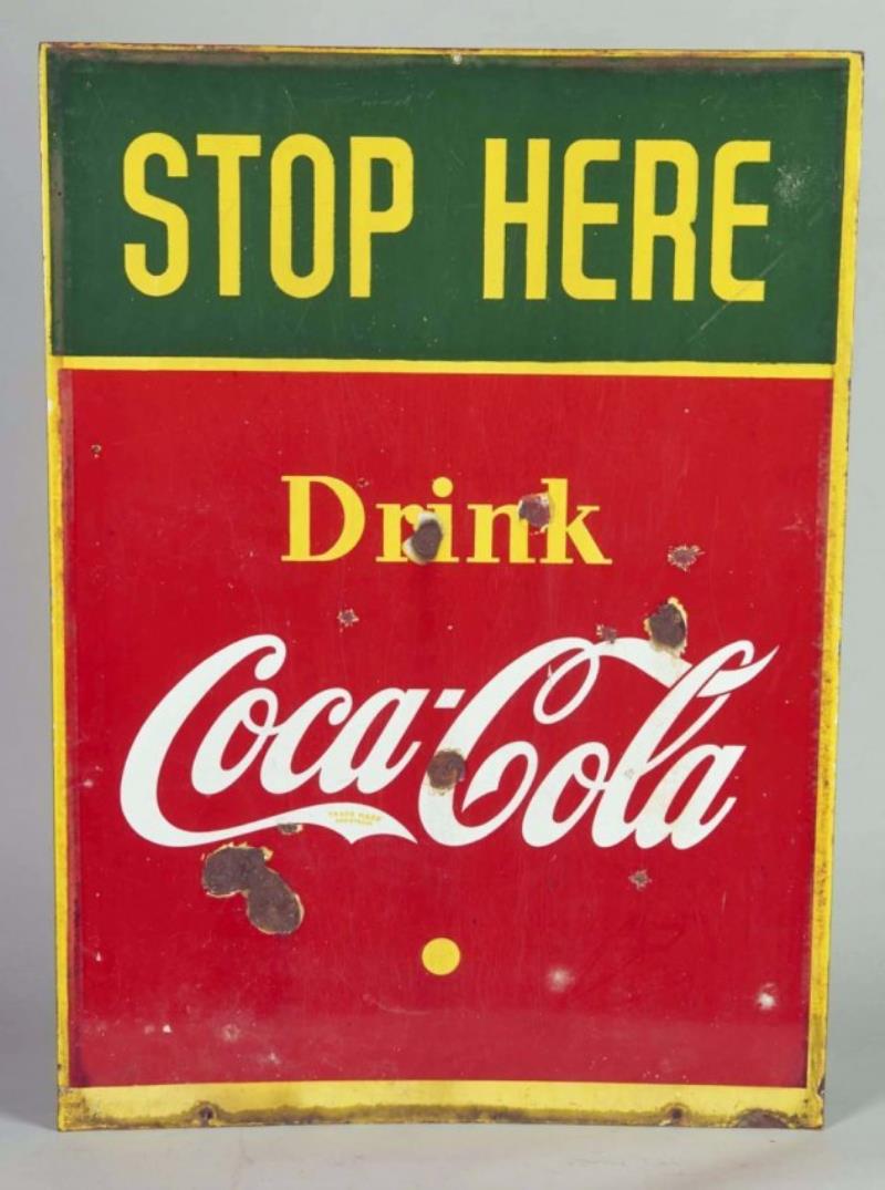 Reads "Stop Here Drink" circa 1941, marked "Made in Canada by P.T. Thomas". Has some chipping. Condition (Very good). Size 26" x 36"