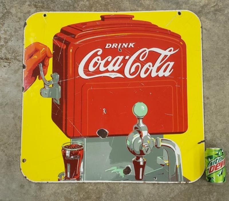 Yellow background with the image of a red Coca-Cola soda fountain. There are two holes drilled along the top edge, and chipping of enamel around the perimeter of the sign and near the holes. Printed in the bottom left corner…