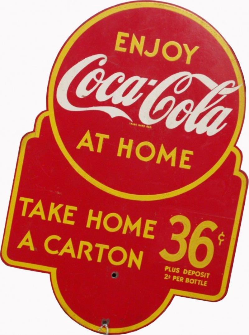 Enjoy Coca Cola At Home Die-Cut Double Sided Tin Sign "36c Take Home A Carton" - 11" x 16"