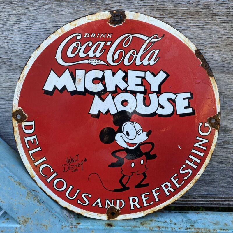 Vintage 1928 Walt Disney Coca Cola Porcelain Mickey Mouse 12” Gas Oil RARE Sign