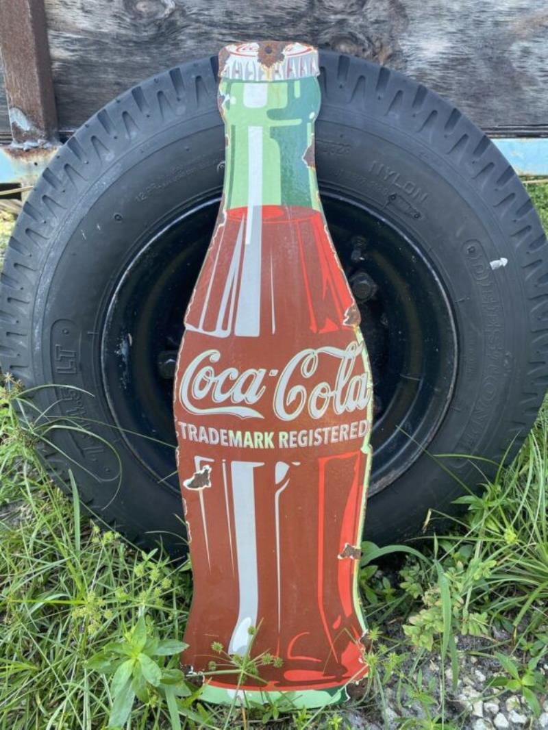 Nice large scale Coke bottle shape. Displays really well, looks GREAT on the wall! This piece shows signs of use and age. Rust and chipping around the mounting holes and edges. This is aGREAT addition to any collection!