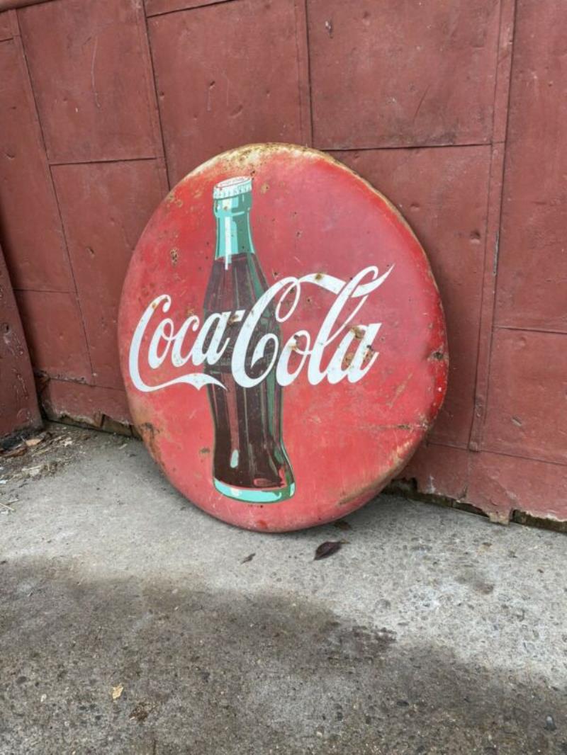 Vintage 1950's Drink Coca Cola Soda Pop Gas Oil 24" Painted Metal Button Sign