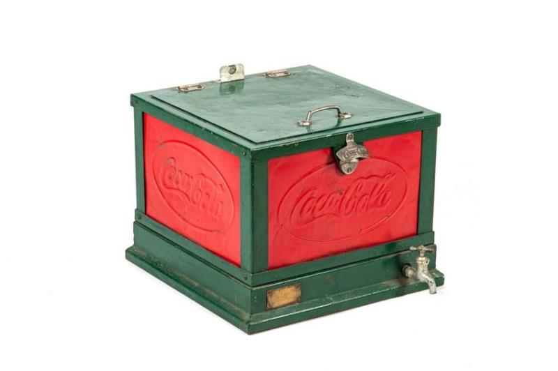 With red embossed side tin panels featuring classic logo, within painted green cooler with bottle opener and pouring spout. Handled lid opens at the top. Small brass plaque shows manufacturing by Glascock Bros. MFG-Co. H. 36 cm (14 1/4 in)…