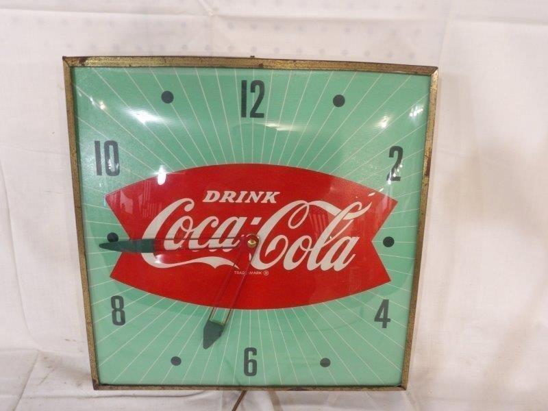 Coca-Cola Clock, Pam lightup fishtail, square gold metal case, VG working cond w/some light oxidation & color fade, 15"Sq.