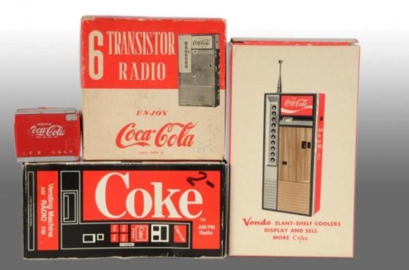Description Includes three Coca-Cola 1950s to 1970s transistor radios and one 1950s music box. Two largest radios are mint and in original box while the small transistor and music box are used with some wear. Condition (7.0 - 9.5, Very…