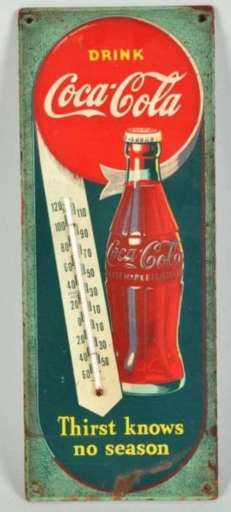 6.75" x 17" Masonite thermometer "Thirst knows no season" with bright colors, edge wear, minor stains, and center hole is broke at top. PLEASE READ & UNDERSTAND THE PAYMENT & SHIPPING TERMS FOR THIS AUCTION PRIOR TO PLACING BIDS. ALL…