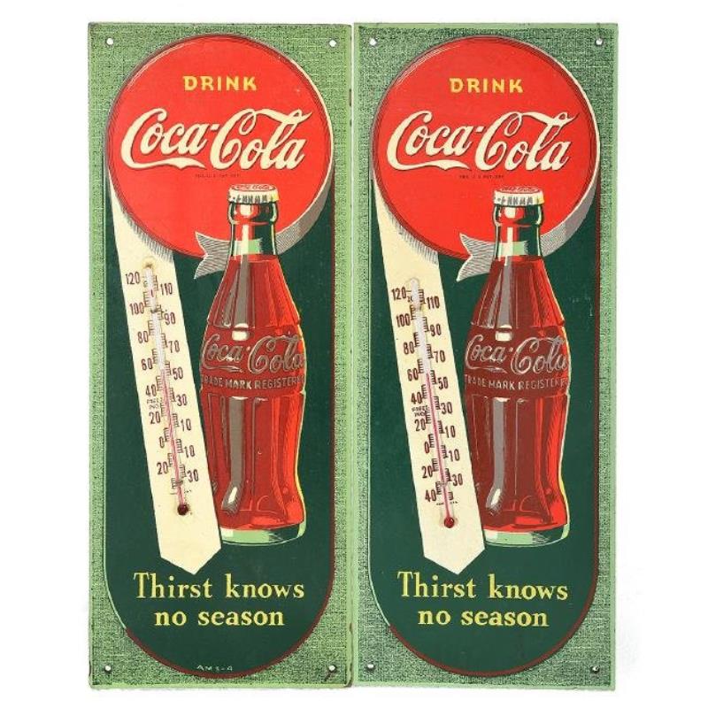 Pair of Masonite Coca-Cola Thermometers. "Thirst knows no season" {Dimensions approximately 17 x 6 3/4 inches} [Condition: Minor scratches and chips around edges.]