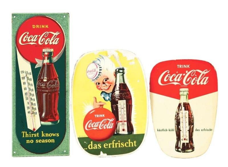 Lot of three various coca Cola thermometers. Lot consists of: first, an American "Thirst Knows No Season" Masonite thermometer with bulb in working condition, sign shows very good color and gloss, minor surface scratching throughout the face; second, a German…