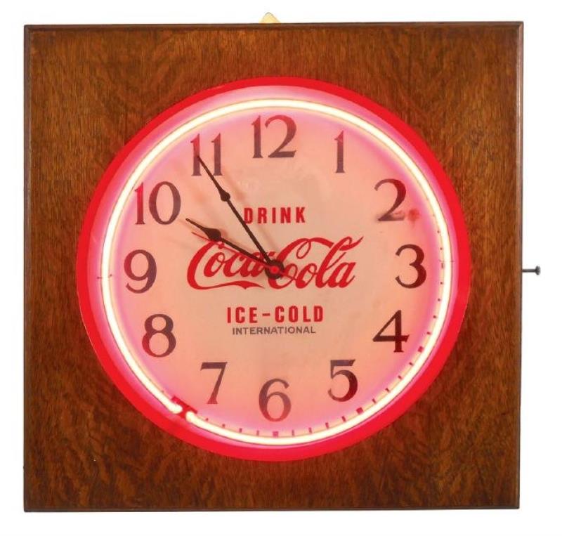 Coca-Cola neon clock, "Drink Coca-Cola Ice Cold", mfgd by International, metal dial in quartersawn oak case, Exc wkg cond, 18.5"Sq.