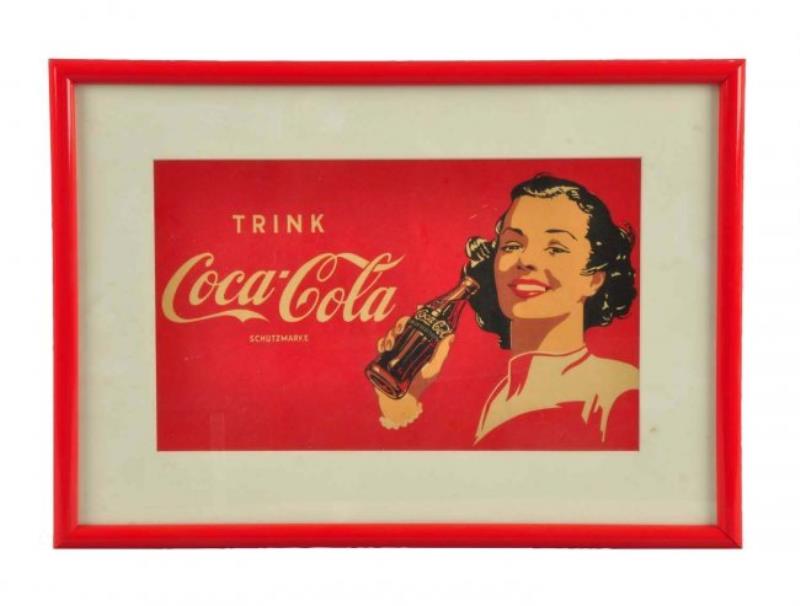 This colorful sign is professionally framed behind glass. This early sign shows a woman enjoying a bottle of Coca-Cola and is titled "Pause a minute refresh yourself." There is some staining on the top and bottom borders and edges. There is also some slight waviness and what looks to be water damage to the top right corner. The colors are strong and vibrant and this is a scarce sign to find. Condition (Very Good). Size Framed: 26" x 17".