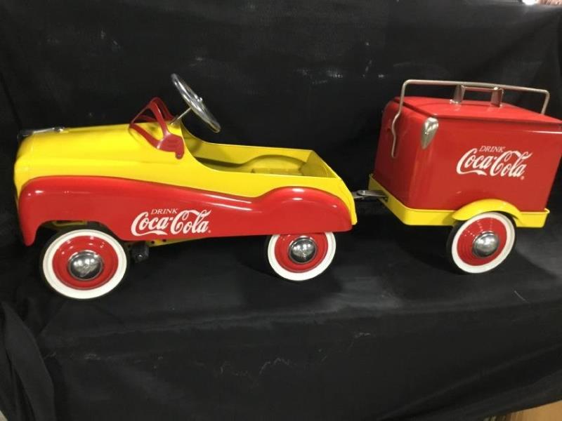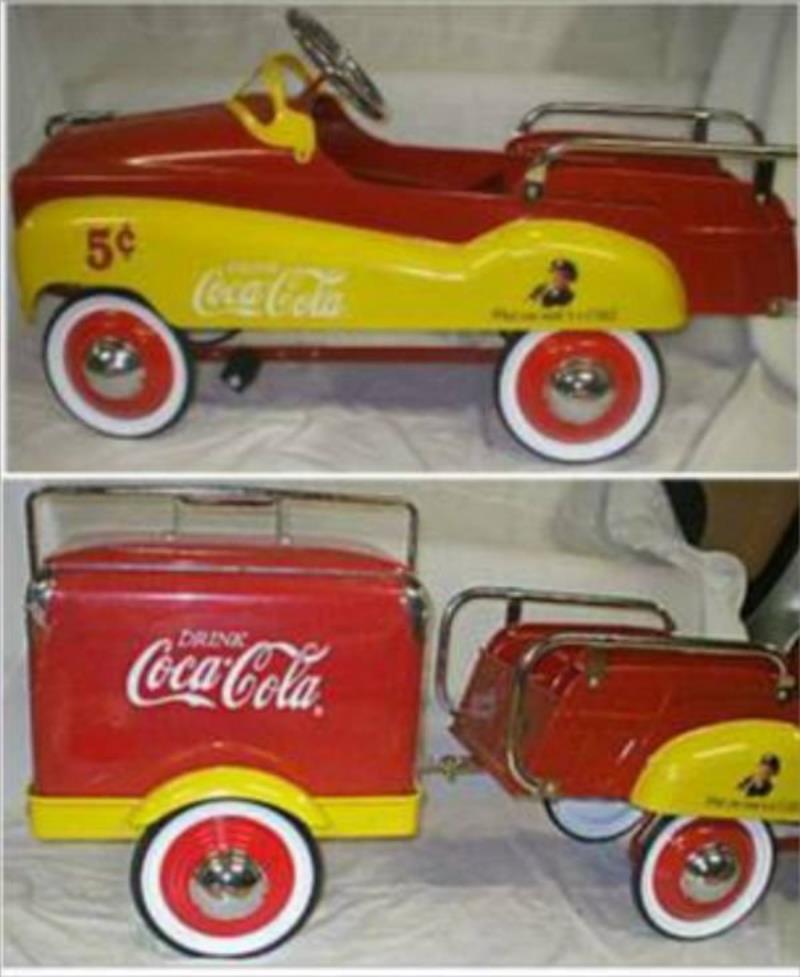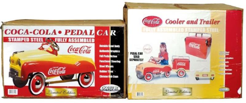 Coca-Cola pedal car w/cooler & trailer, limited edition mfgd by Gearbox Pedal Car Co., authentic graphics, fully functional, stamped steel, NOS cond w/orig boxes, 21"H x 56"L.