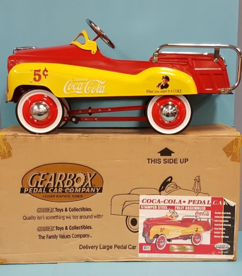 Gearbox Branded Coca-Cola Station Wagon Pedal Car with Reproduction Vintage Ice Chest Marks: Drink Coca-Cola, What you want is a COKE, 5ยข, GEARBOX 44 x 22 x 16 inches (111.8 x 55.9 x 40.6 cm) This Coca-Cola pedal station wagon…