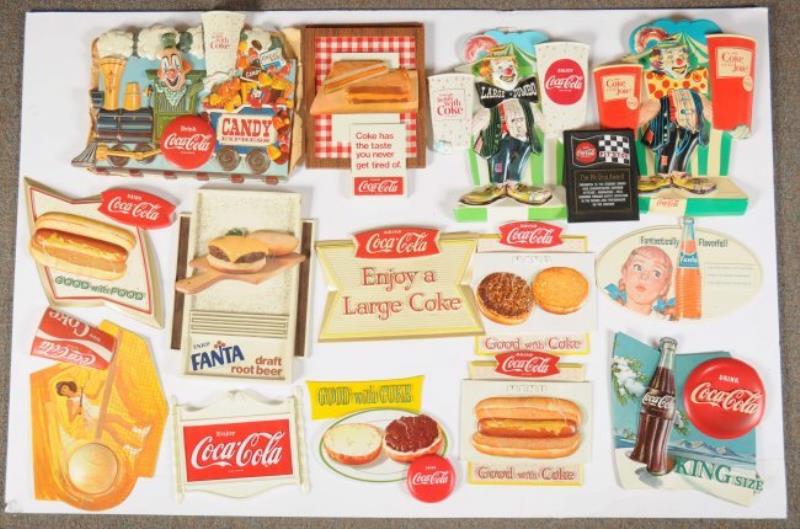 Lot of nine cardboard advertisements. The first one is of a pretty girl drinking product, says "Have a Coke" and has a Coke button. The second one has a the word "Lunch" with foldable tabs, the third one has the…