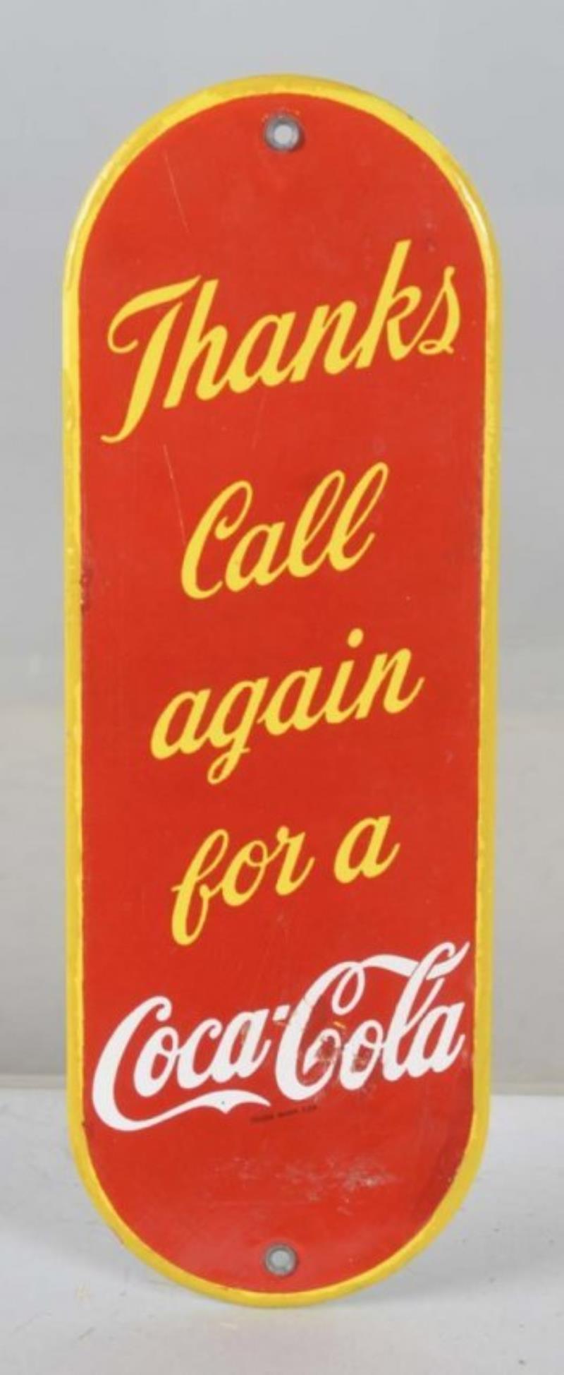This 1940s door push and has small damage to the Coke logo and paint retouch at the bottom right. Condition (Very Good). Size 11-1/2" L.