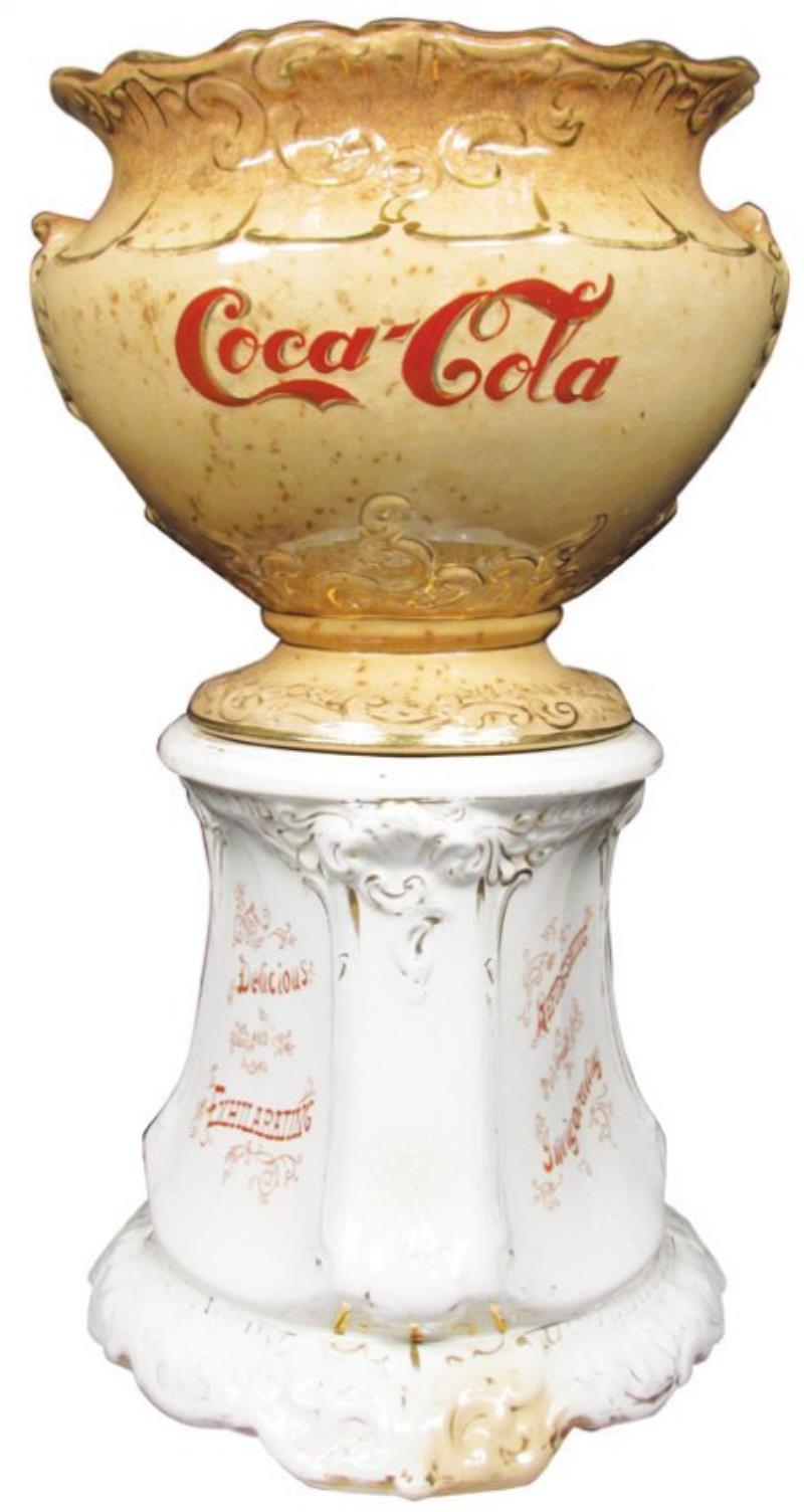 Coca-Cola syrup dispenser, The Wheeling Pottery Co. stamped on bottom of bowl & base, c.1896, no lid, some stain & discoloring on bowl but no chips or cracks, VG overall cond, 18"H x 10"Dia.