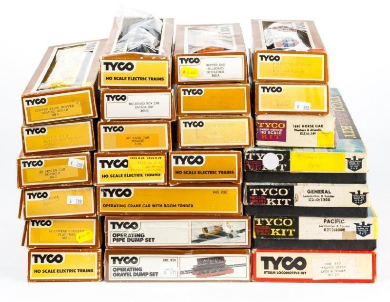 DESCRIPTION: Twenty-four Tyco rolling stock in original boxes. Includes 374B Coca-Cola 50' boxcar, 358B Morton Salt center flow hopper, 359C Planters 54' covered hopper, 358D Sanka center flow hopper, 360F Popsicle 62' reefer, 365E Canadiana boxcar, 358C Domino Sugar center…