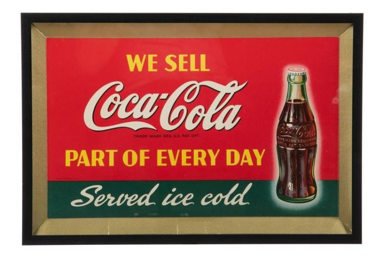 Framed single sided cardboard. Fantastic color with only minor flaws. Marked Snyder & Black and is dated 1942. Great Coke piece that displays very well. Measures: 16"X23" Rating: 9 Est: $350-$700