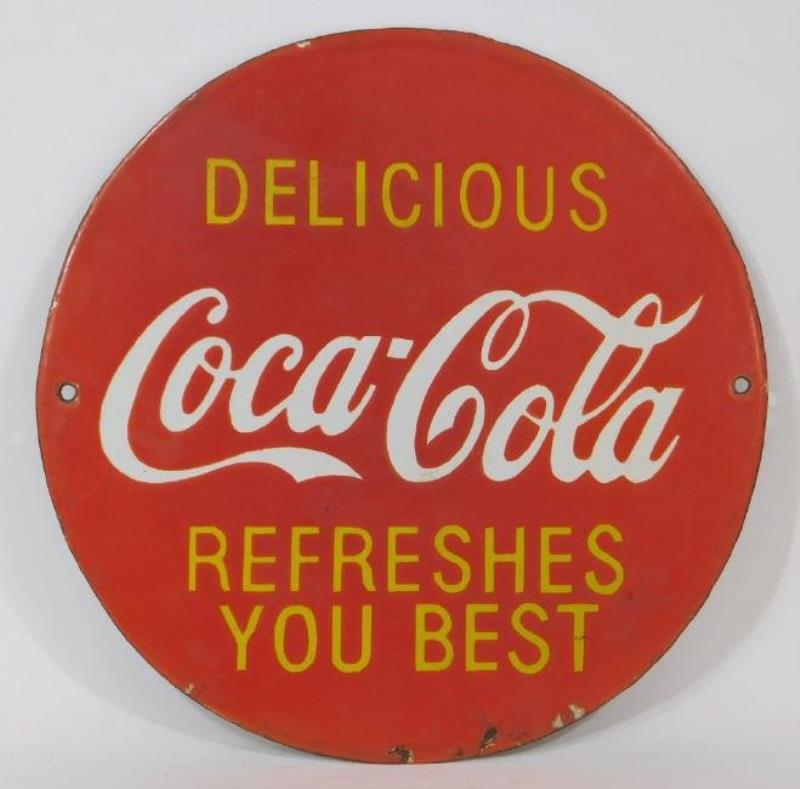 United States,Mid 20th CenturyOne sided advertising sign that reads "Delicious Coca-Cola Refreshes You Best".Steel and porcelain,12" in diameter,From the collection of Russell Buteau, Millville, Massachusetts. Life long collector of Coca-Cola and antiques for over 40 years.