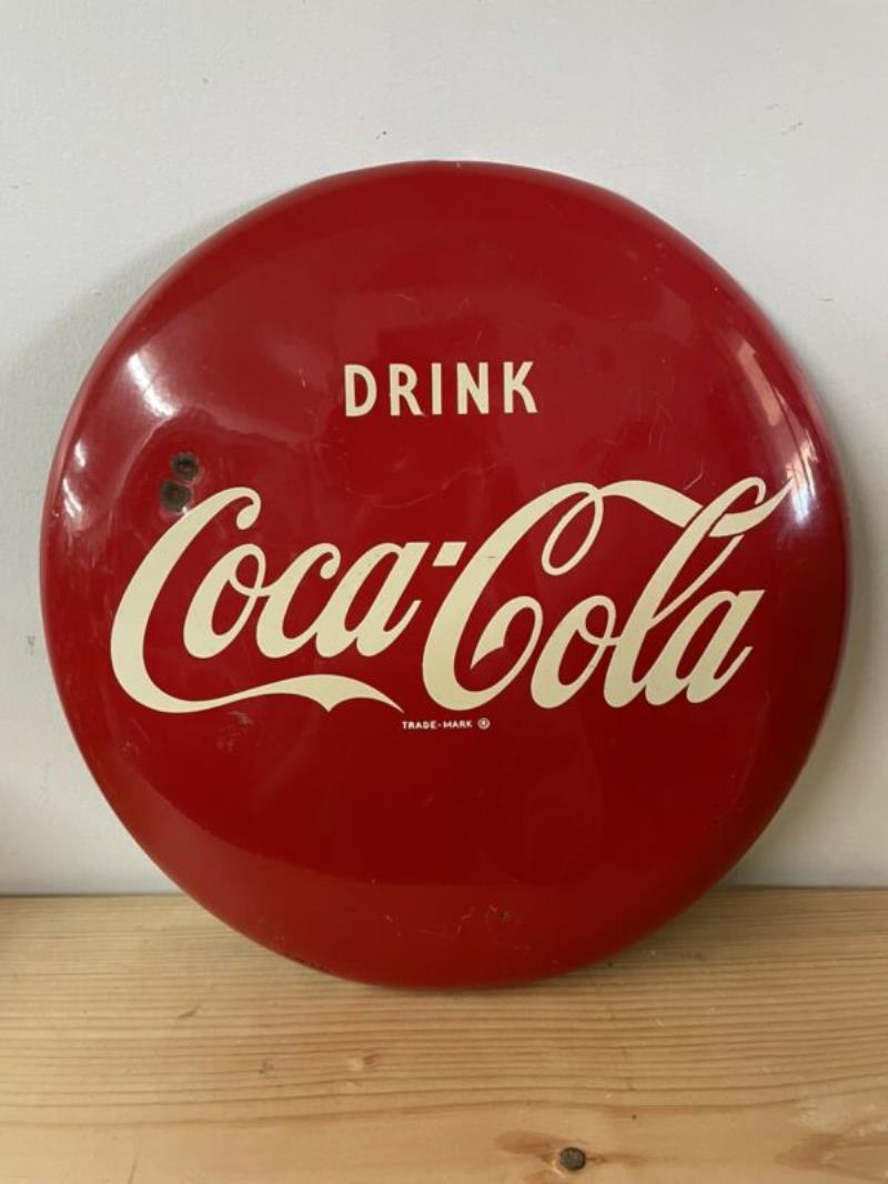 Vintage Drink Coca-Cola Painted 12" Red Button Advertising Ad Soda Sign